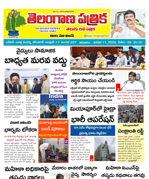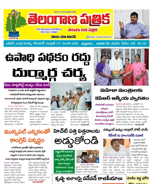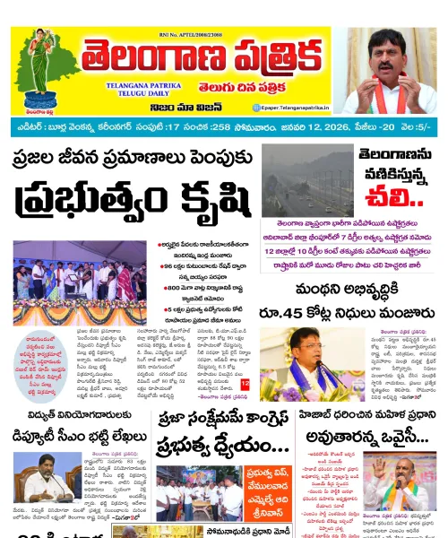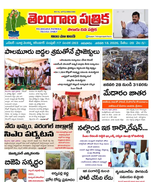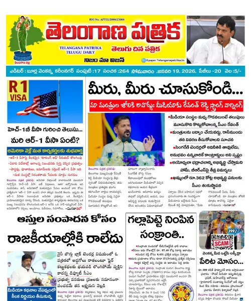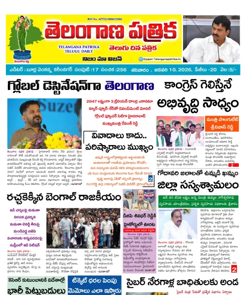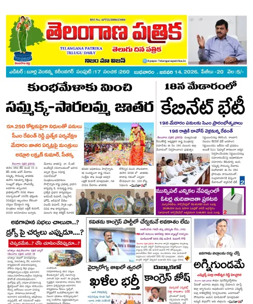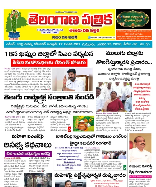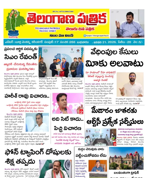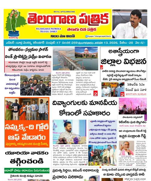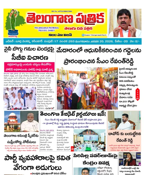 Welcome to Telangana Patrika News Digital Edition- 4 కోట్ల తెలంగాణ ప్రజల చప్పుడు గత 17 సంవత్సరాలుగా దిగ్విజయంగా కొనసాగుతున్న పత్రిక, ప్రతిరోజు ఉదయం 5 గంటలకే మీ ఇంటి ముందు కలర్ పేజీలతో పేపర్ - తెలంగాణ పత్రిక For Advertisement contact:7680072285.