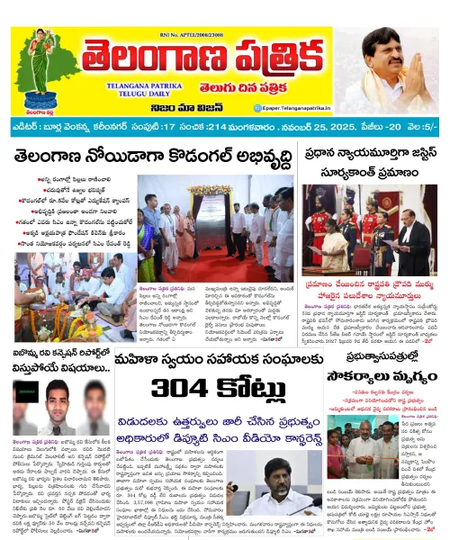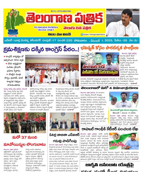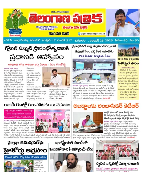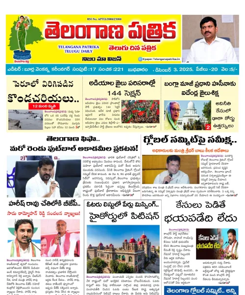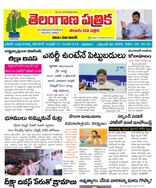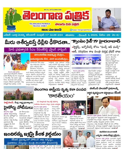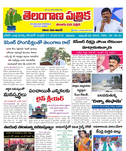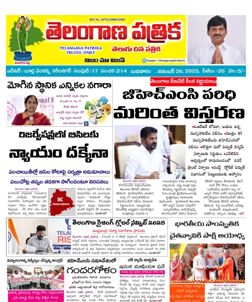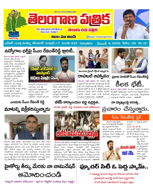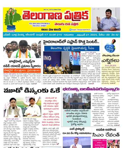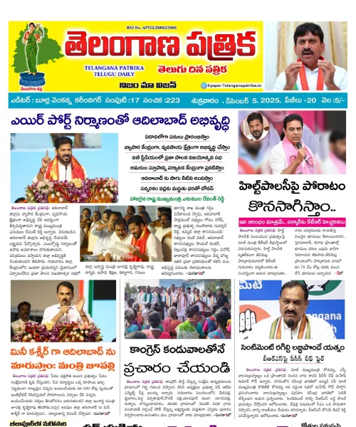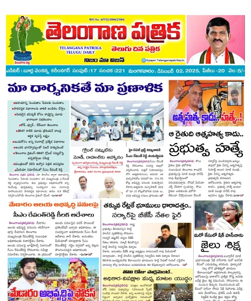 Welcome to Telangana Patrika News Digital Edition- 4 కోట్ల తెలంగాణ ప్రజల చప్పుడు గత 17 సంవత్సరాలుగా దిగ్విజయంగా కొనసాగుతున్న పత్రిక, ప్రతిరోజు ఉదయం 5 గంటలకే మీ ఇంటి ముందు కలర్ పేజీలతో పేపర్ - తెలంగాణ పత్రిక For Advertisement contact:7680072285.