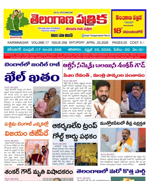 Welcome to Telangana Patrika News Digital Edition- 4 కోట్ల తెలంగాణ ప్రజల చప్పుడు గత 18 సంవత్సరాలుగా దిగ్విజయంగా కొనసాగుతున్న పత్రిక, ప్రతిరోజు ఉదయం 5 గంటలకే మీ ఇంటి ముందు కలర్ పేజీలతో పేపర్ - తెలంగాణ పత్రిక For Advertisement contact :7680072285.