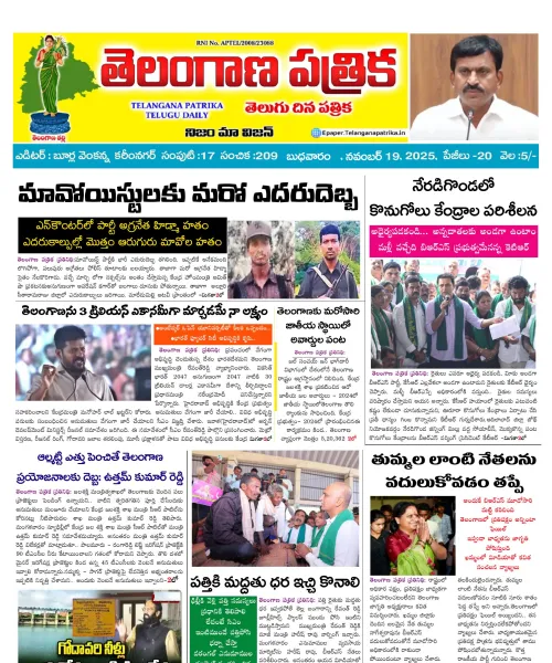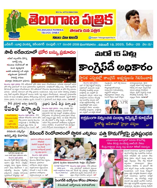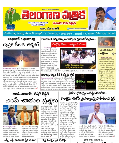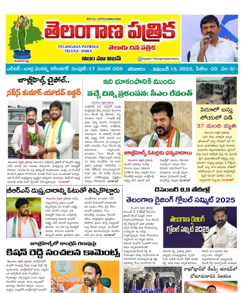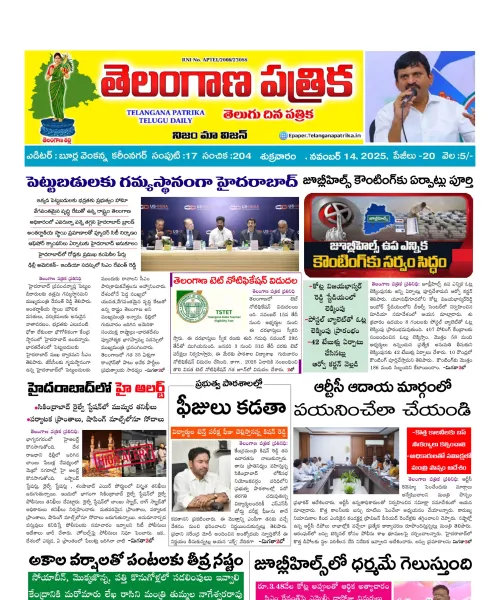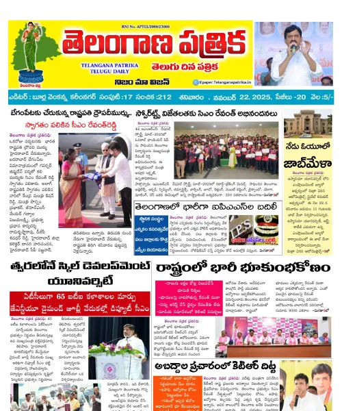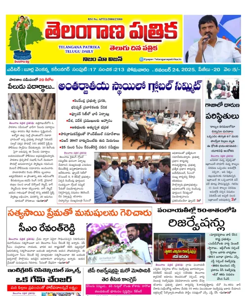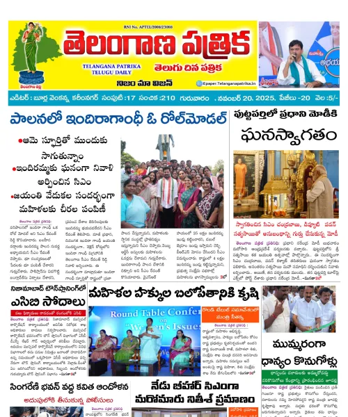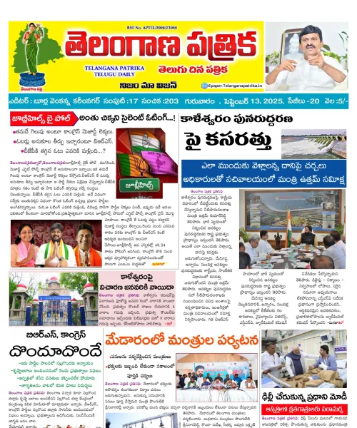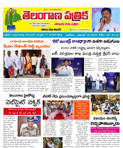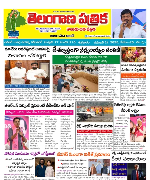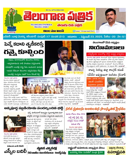 Welcome to Telangana Patrika News Digital Edition- 4 కోట్ల తెలంగాణ ప్రజల చప్పుడు గత 17 సంవత్సరాలుగా దిగ్విజయంగా కొనసాగుతున్న పత్రిక, ప్రతిరోజు ఉదయం 5 గంటలకే మీ ఇంటి ముందు కలర్ పేజీలతో పేపర్ - తెలంగాణ పత్రిక For Advertisement contact:7680072285.