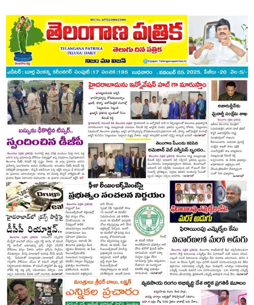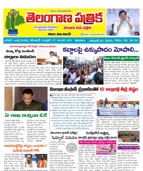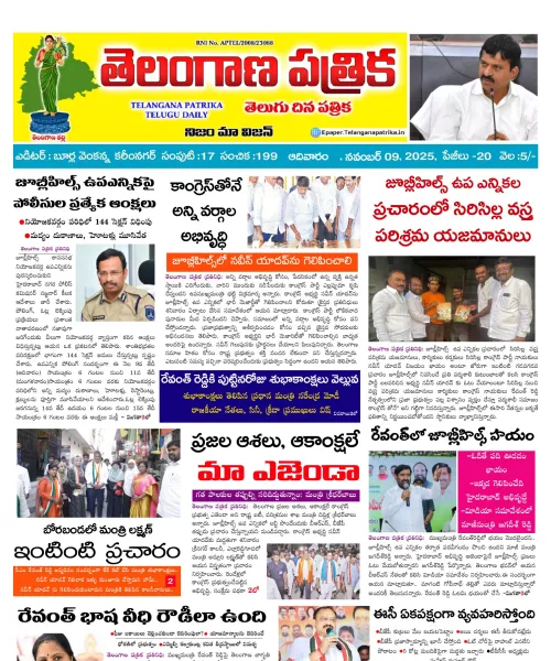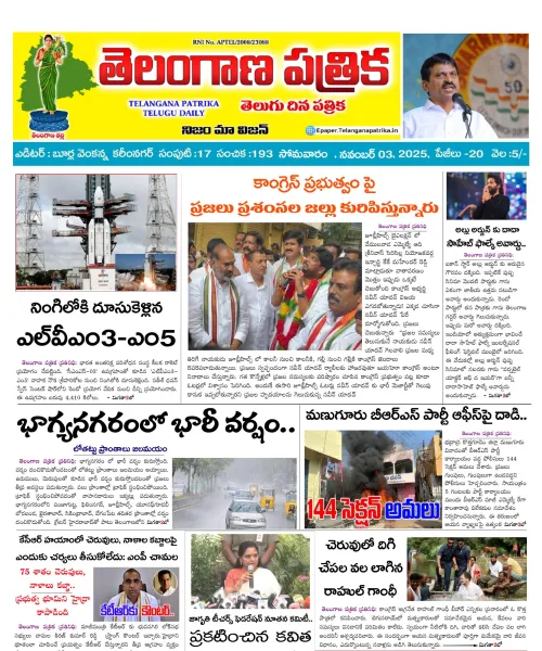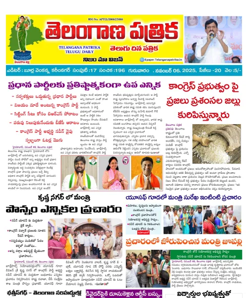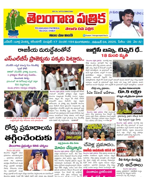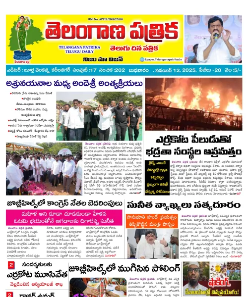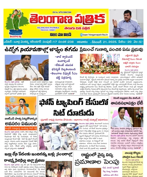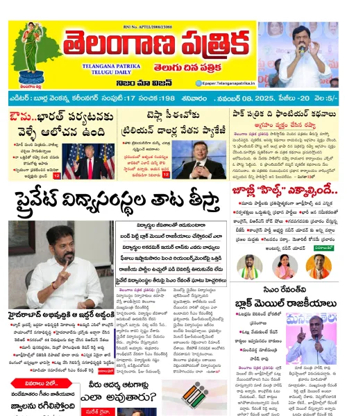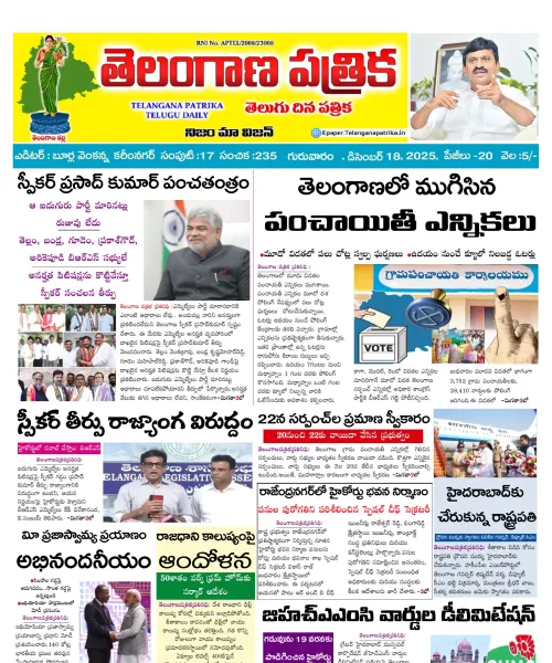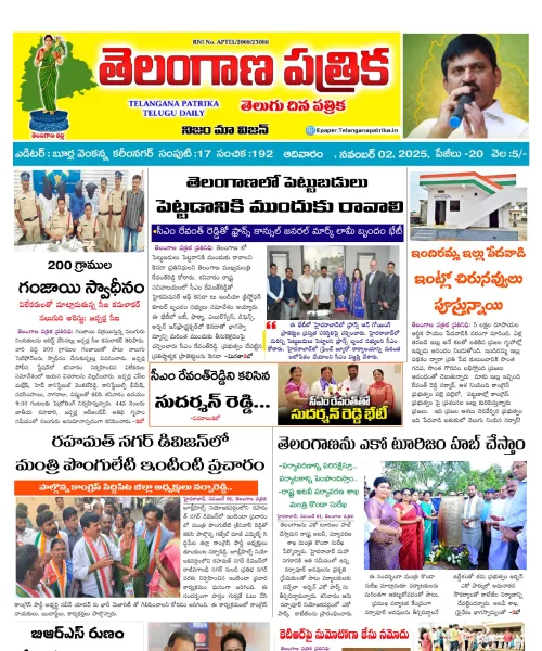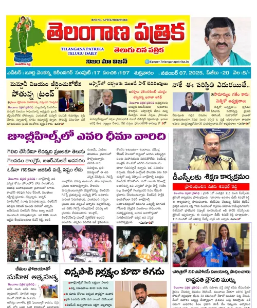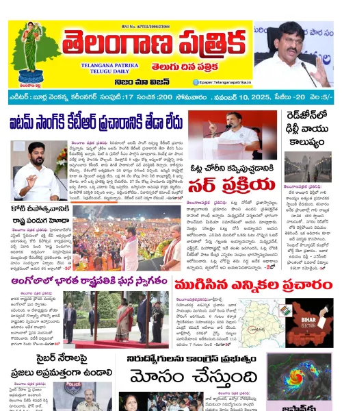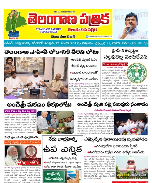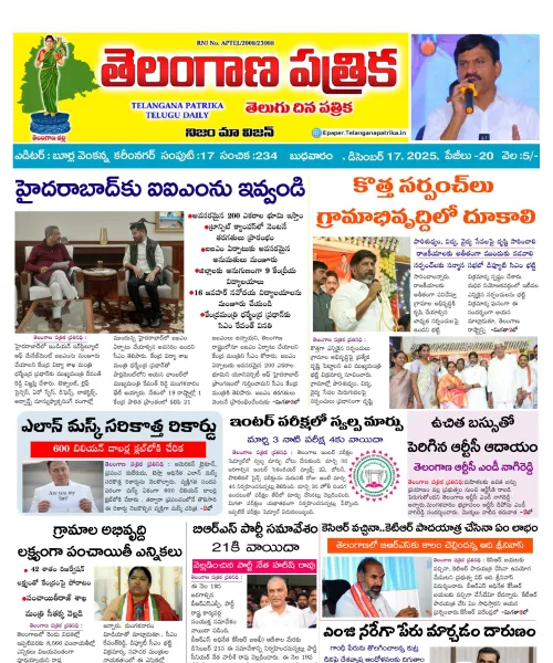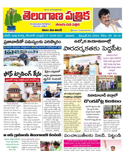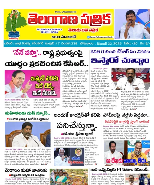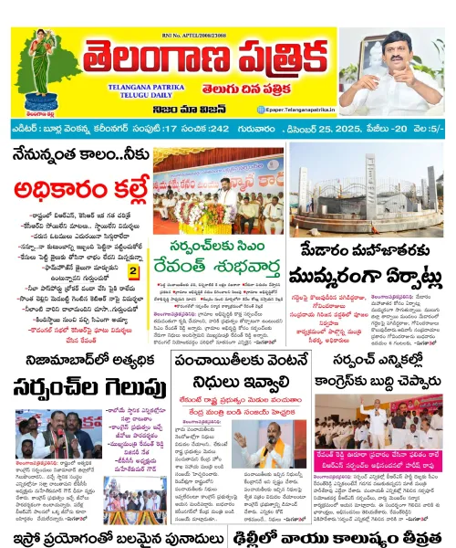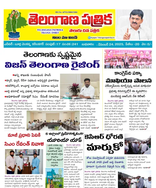 Welcome to Telangana Patrika News Digital Edition- 4 కోట్ల తెలంగాణ ప్రజల చప్పుడు గత 17 సంవత్సరాలుగా దిగ్విజయంగా కొనసాగుతున్న పత్రిక, ప్రతిరోజు ఉదయం 5 గంటలకే మీ ఇంటి ముందు కలర్ పేజీలతో పేపర్ - తెలంగాణ పత్రిక For Advertisement contact:7680072285.