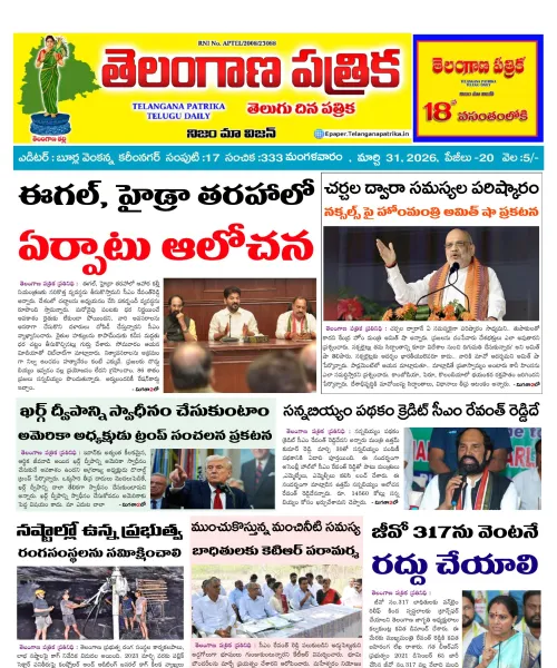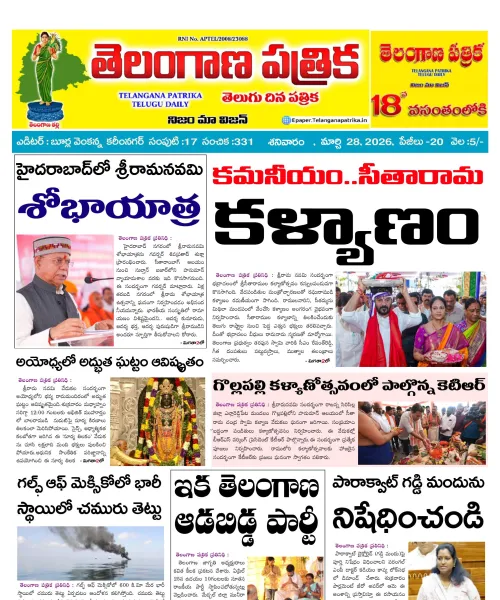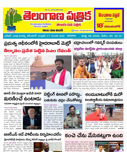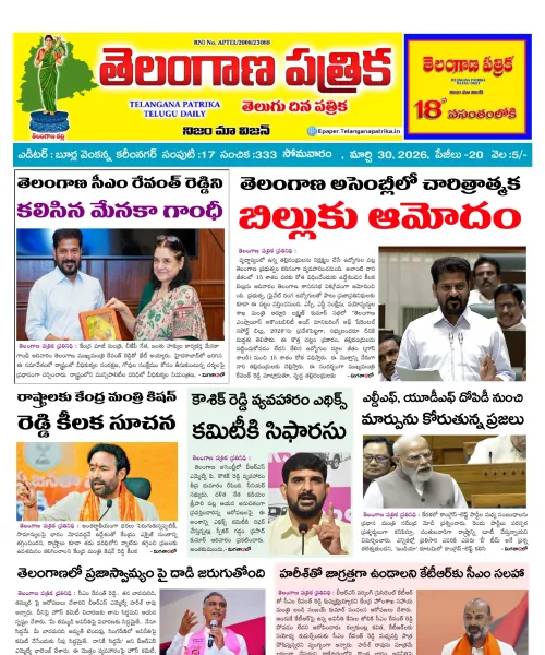 Welcome to Telangana Patrika News Digital Edition- 4 కోట్ల తెలంగాణ ప్రజల చప్పుడు గత 18 సంవత్సరాలుగా దిగ్విజయంగా కొనసాగుతున్న పత్రిక, ప్రతిరోజు ఉదయం 5 గంటలకే మీ ఇంటి ముందు కలర్ పేజీలతో పేపర్ - తెలంగాణ పత్రిక For Advertisement contact :7680072285.