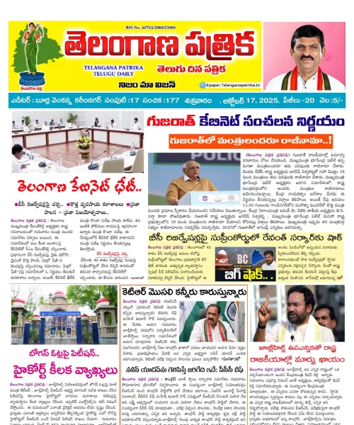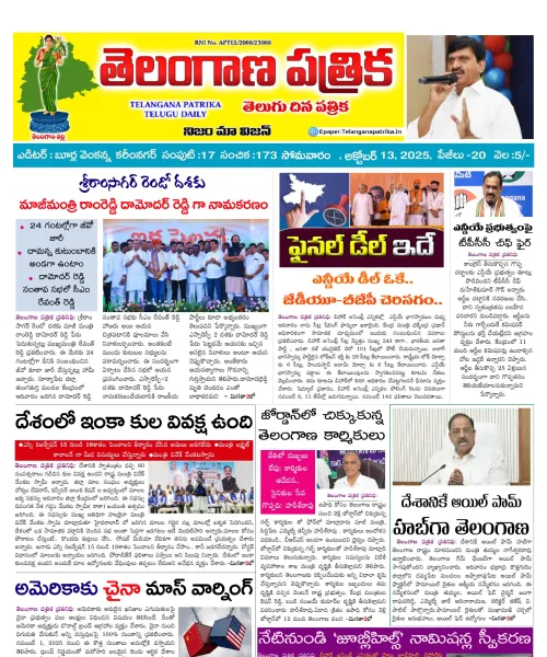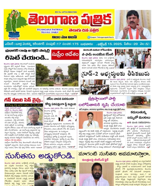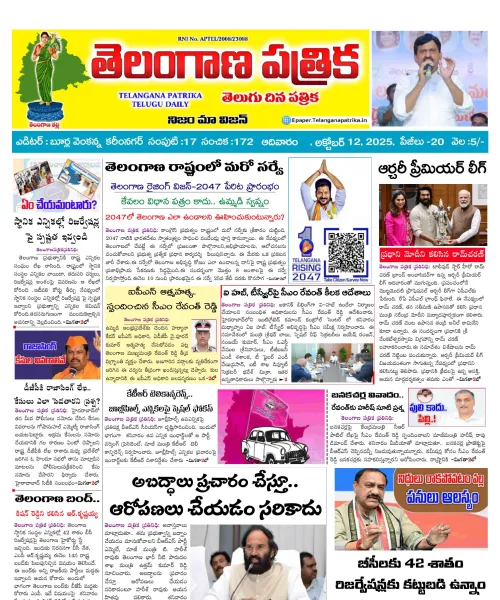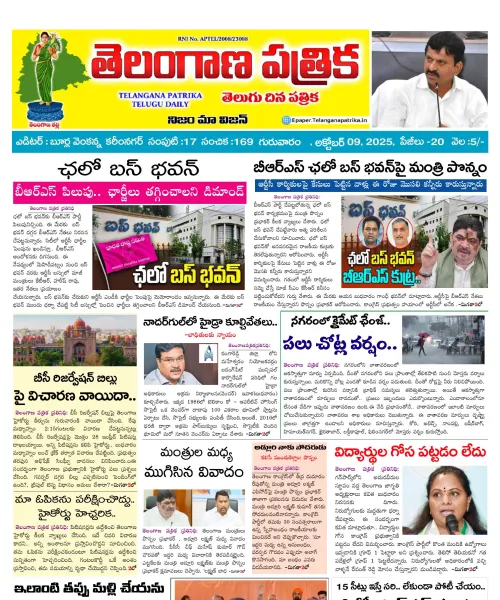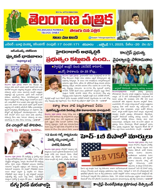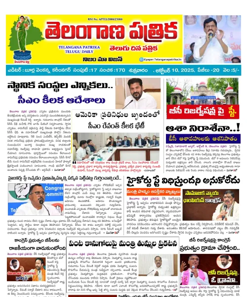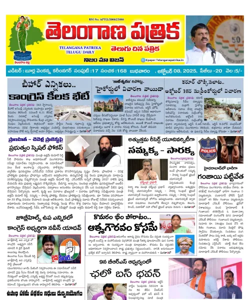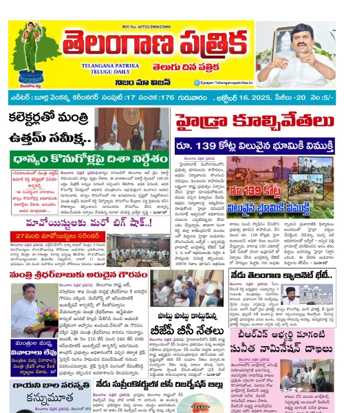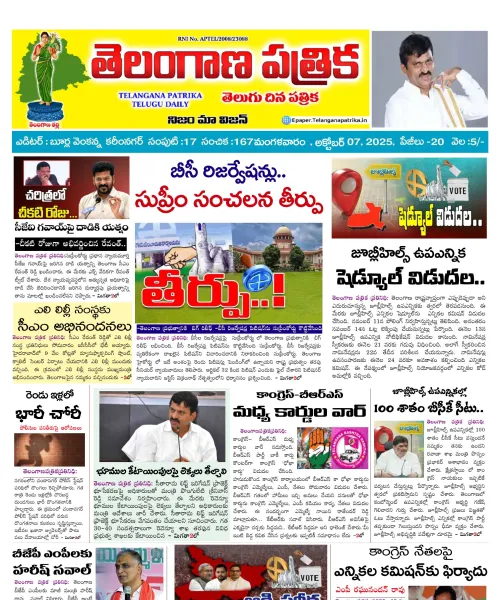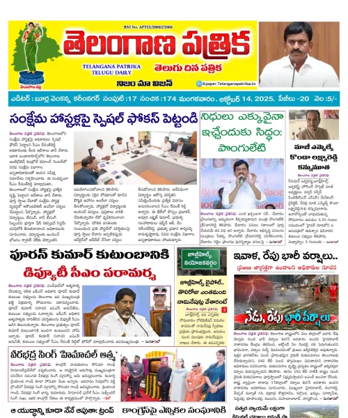 Welcome to Telangana Patrika News Digital Edition- 4 కోట్ల తెలంగాణ ప్రజల చప్పుడు గత 17 సంవత్సరాలుగా దిగ్విజయంగా కొనసాగుతున్న పత్రిక, ప్రతిరోజు ఉదయం 5 గంటలకే మీ ఇంటి ముందు కలర్ పేజీలతో పేపర్ - తెలంగాణ పత్రిక For Advertisement contact:7680072285.
