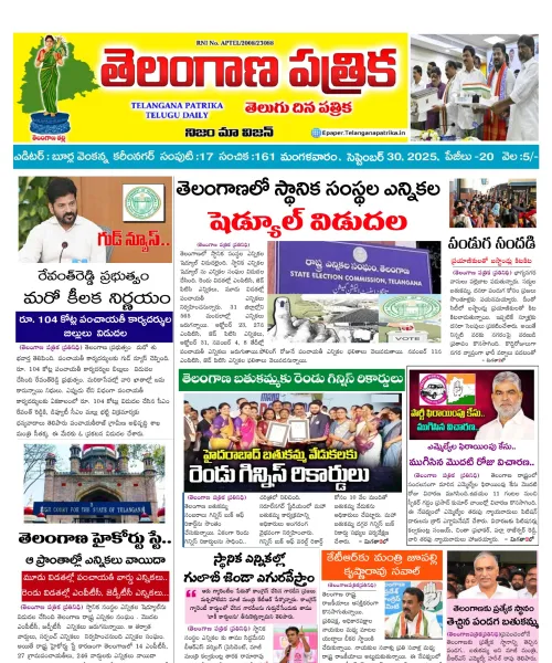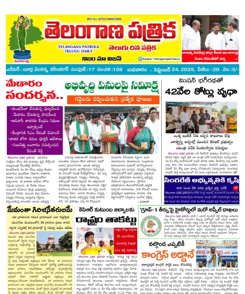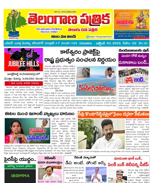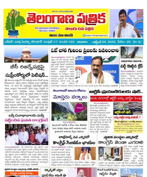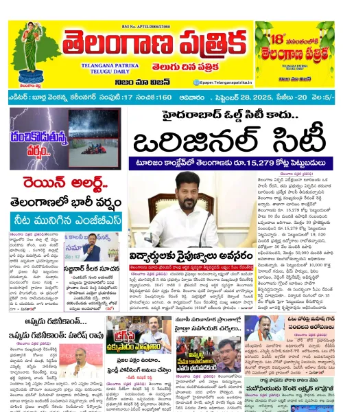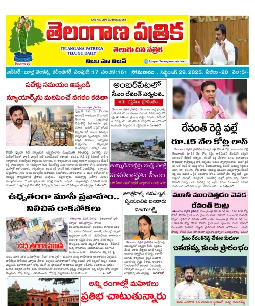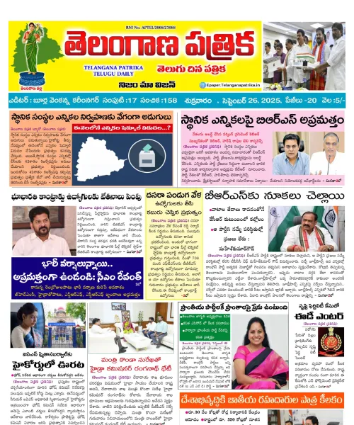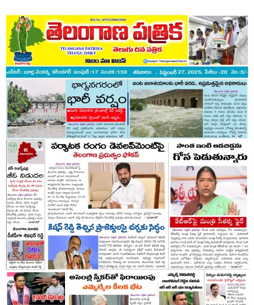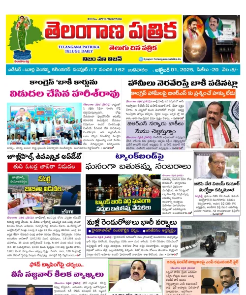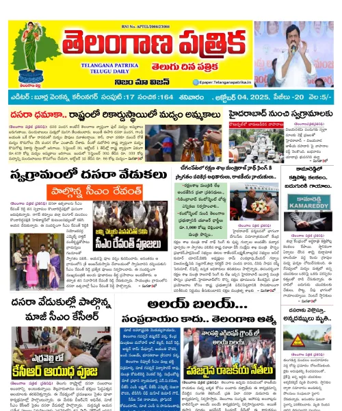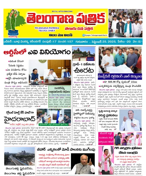 Welcome to Telangana Patrika News Digital Edition- 4 కోట్ల తెలంగాణ ప్రజల చప్పుడు గత 17 సంవత్సరాలుగా దిగ్విజయంగా కొనసాగుతున్న పత్రిక, ప్రతిరోజు ఉదయం 5 గంటలకే మీ ఇంటి ముందు కలర్ పేజీలతో పేపర్ - తెలంగాణ పత్రిక For Advertisement contact:7680072285.
